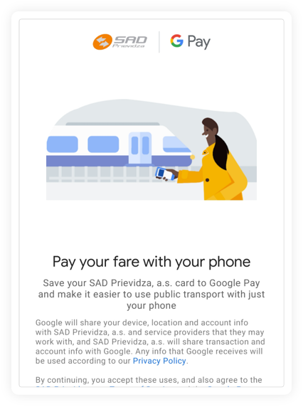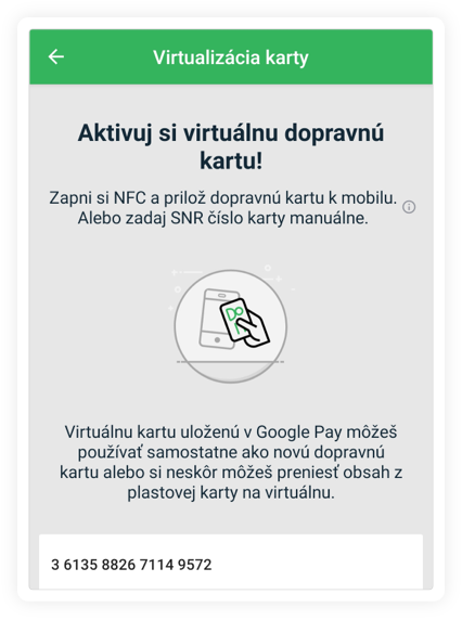 Svoju plastovú kartu si jednoducho prenesieš do mobilu a aktivuješ si tak novú virtuálnu dopravnú kartu. Virtuálnu kartu v Peňaženke Google budeš mať ako novú dopravnú kartu, na ktorú si môžeš kupovať kredit alebo predplatné časové lístky. Ak chceš používať obe dopravné karty (virtuálnu aj plastovú kartu), máš samostatný účet u svojho dopravcu pre každú kartu. Ak chceš používať iba virtuálnu kartu, môžeš si kedykoľvek preniesť obsah z plastovej karty na virtuálnu a pôvodná plastová karta bude zablokovaná.