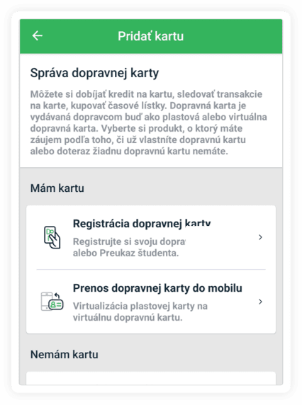 1AAk nemáš dopravnú kartu pripojenú v aplikácii Ubian: v obrazovke Karta cez ikonku „+“ zvoľ možnosť Prenos dopravnej karty do mobilu.