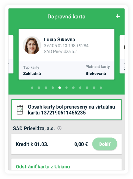4Virtuálna karta je zobrazená v Ubiane s ikonkou mobilu, môžeš si dobíjať kredit, kupovať časové lístky pohodlne z mobilu. Karta je platná jeden rok, po uplynutí platnosti stačí platnosť predĺžiť.